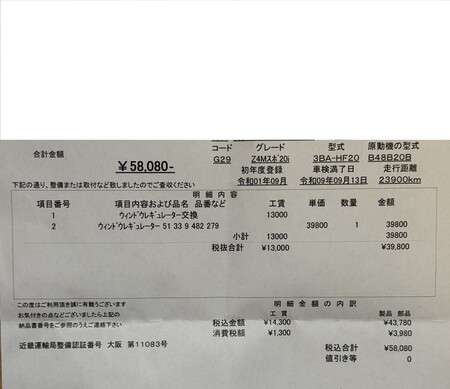 こちらが今回のZ4 G29のパワーウインドウレギュレーターの交換費用の領収書です。