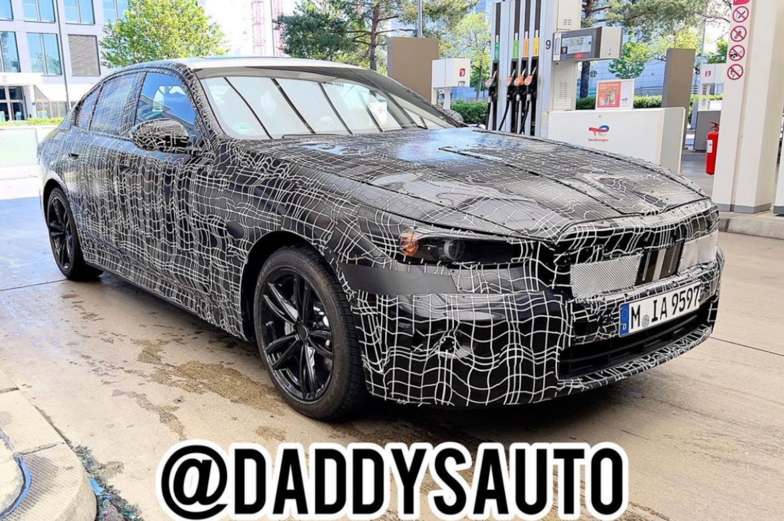 白黒のラッピングが施された迷彩模様の車がガソリンスタンドに停まっている。画像の上には「@DADDYSAUTO」と書かれている。. BMW