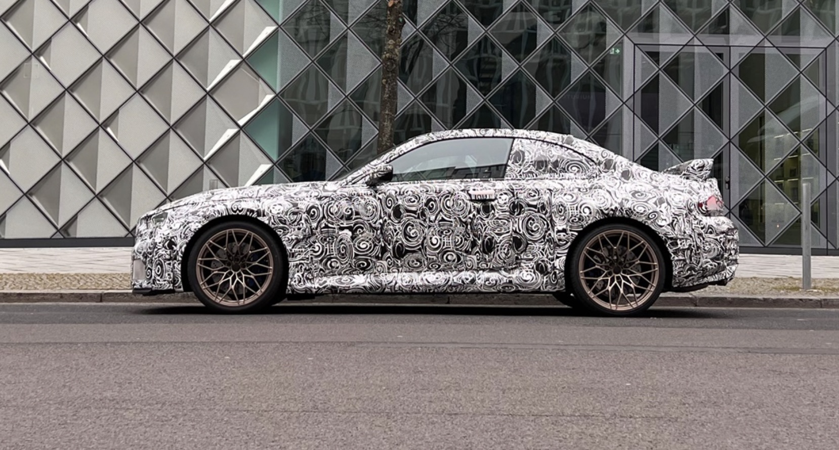 幾何学的なガラスの建物の横に駐車されたカモフラージュされたスポーツカー。建物の背後には葉のない木があります。. BMW