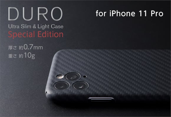 白地に「DURO Special Edition」とDeffのブランドが入った、ブラックカーボンファイバー製のiPhone 11 Proケース。. PC & インターネット
